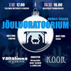 Kontsert „Jõuluootusˮ. Urmas Sisaski „Jõuluoratooriumˮ ja valik armastatud jõululaule, segakoor K.O.O.R. ja Vanalinna Segakoor, dirigendid Raul Talmar ja Lauri Aav, solistid Aule Urb ja Mati Turi, kaastegev orkester. Pilet piletitasku.ee 15/10 €, kuni 12 a (k.a) tasuta, toetajapilet 30 € (toomkirik).
