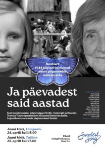 Kirikukontsert „Ja päevadest said aastad“ 1944. a suurpõgenemise mälestuseks. Eesti koorimuusikat ja vanemate põgenemislugusid esitab Rootsi eestlaste koor SweedEstSong. Pilet 7 € müügil enne algust kohapeal (Jaani kirik).