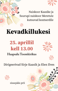 Kirikukontsert „Kevadkillukesiˮ, naiskoor Kaasike ja Suurupi naiskoor Meretule, dirigendid Sirje Kaasik ja Elen Ilves. Sissepääs prii (toomkirik). 25. apr. 2026 kell 13:00 Haapsalu Toomkirik